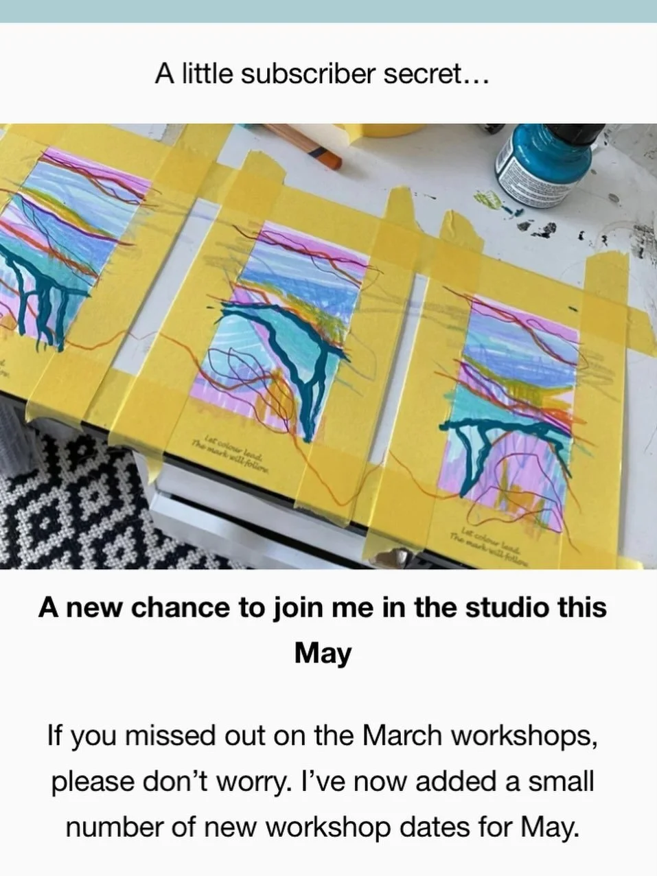 You're warmly invited to visit my peaceful garden studio, where you can explore my colourful, coastal-inspired contemporary paintings in person. It's a relaxed and welcoming space with no obligation to buy - just come for a look, a chat and a little creative inspiration.